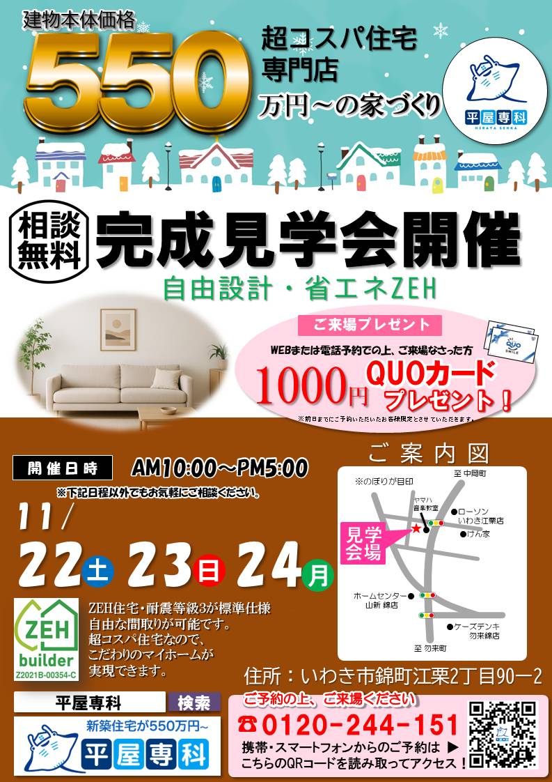 WEBからのご予約&ご来場でもれなくQUOカード進呈平屋専科 いわき店から完成見学会のお知らせです。